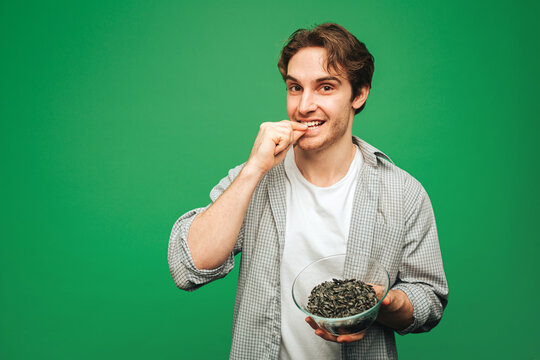 Young man eating cereal while scrolling smartphone at kitchen table morning routine