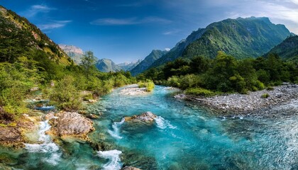 Une rivière cristalline serpentant à travers des montagnes, entourée de biodiversité florissante.
