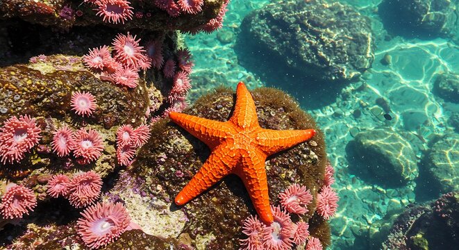 Étoile de mer orange vif entourée d'anémones roses dans une eau cristalline. Photo de stock pour la faune marine, les récifs coralliens et la biodiversité.