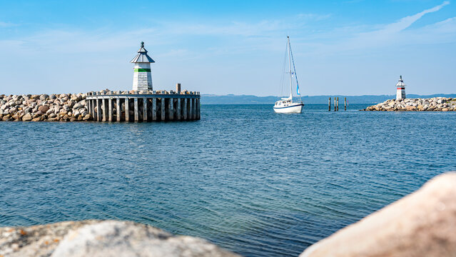 Blick auf die Hafeneinfahrt und die Signallichter von Ebeltoft während gerade ein weißes Segelboot einläuft, Steine unscharf im Vordergrund, horizontal