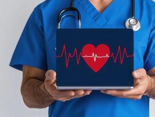 Doctor with red awareness ribbon and ecg background