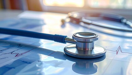 Close-up of a stethoscope resting on a medical chart with EKG lines