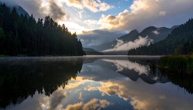 A tranquil lake mirrors a sunrise with mountains and forest. Clouds and trees frame the serene waters