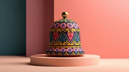 Colorful ornate decorative object on geometric background for interior design inspiration