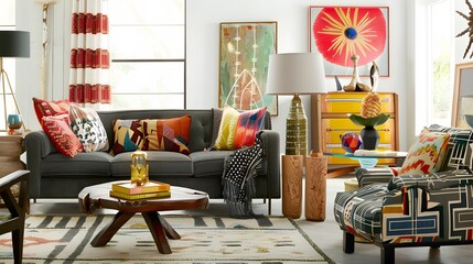 A vibrant eclectic living room with a mix of patterned sofas, colorful art, and unique decor items., interior design, 3d render, Home decoration, Wall Mockup