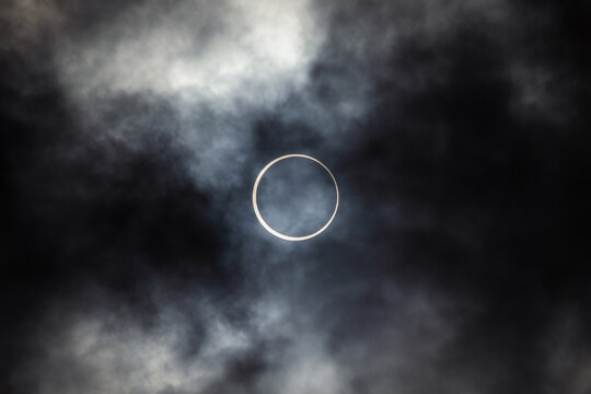 Annular eclipse also called Ring of fire through dark clouds in San Antonio, Texas