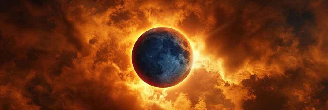 solar eclipse image with the moon blocking the sun and the sky filled with orange light