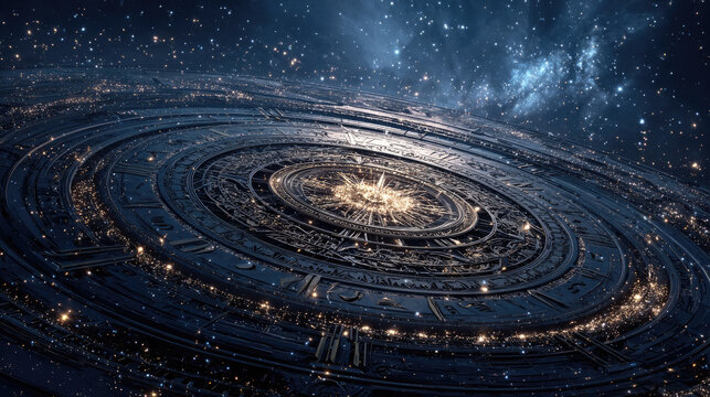 Zodiac wheel spinning on starry night sky, mystical astrology concept with horoscope and star signs, cosmic background, copy space