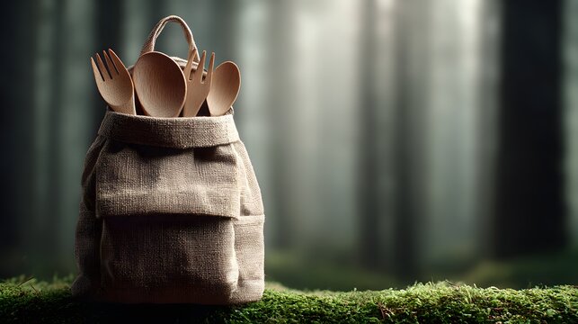 Eco-friendly reusable cutlery rests on a backpack with a serene forest backdrop, promoting sustainable outdoor dining.