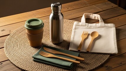 Eco-friendly reusable items for sustainable living on a wooden table.