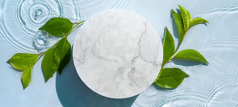 Minimal modern empty product display on water background with waves and splashes and green plants