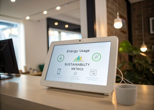 Energy usage dashboard sustainability metrics eco icon green interface modern tablet office desk plant natural light clean design data visualization conveys calm focus and mindful work vibe
