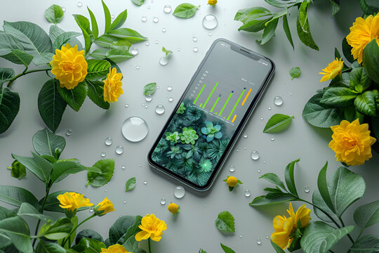 Mockup, smartphone screen displaying app interface with eco-friendly activity tracking, surrounded by vibrant yellow flowers and fresh green leaves, sustainability and environmental focus, eco