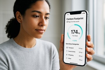 Woman checking carbon footprint tracking app on smartphone, monitoring CO2 emissions data and eco habits in minimal business setting background. Ai generative