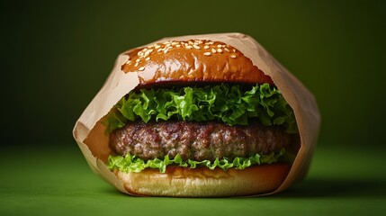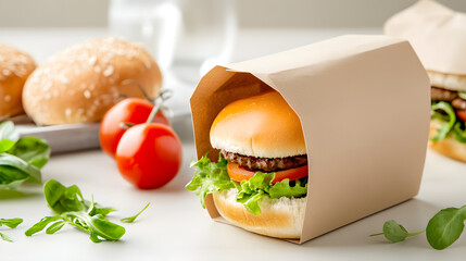 Biodegradable packaging plant based burger paper wrap eco friendly takeaway juicy plant based burger biodegradable paper wrap white table, fresh lettuce tomato and greens around, minimal style
