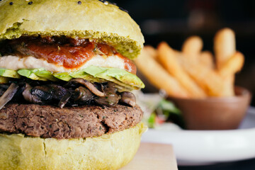 Vegan gourmet burger, bean meat, mushroom, avocado and salsa.
