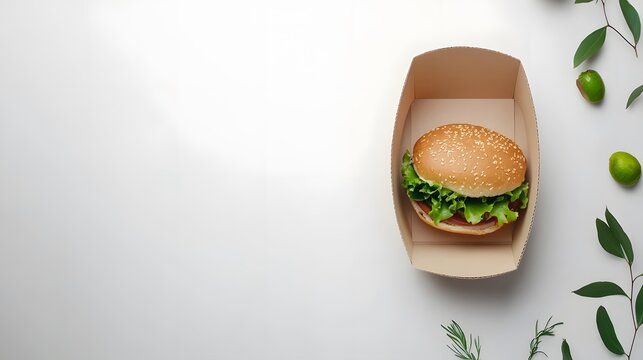 Delicious hamburger lying in cardboard box on white table decorated with green plants