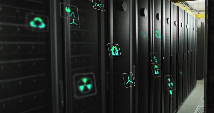 Eco icons overlay on computer servers illustrating digital green technologies