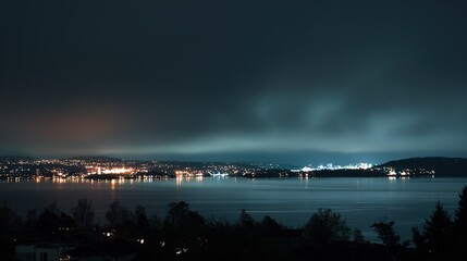 Oslo fjord urban-nature interface: distant city lights glow on dark abstract water. Modern landscape for wall art, ecological concepts, or travel website backgrounds.