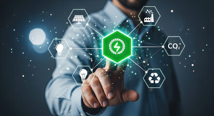 Man interacts with green energy icons projected on digital interface in a technology focused setting