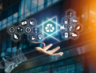 Reduce using smartphone surrounded by sustainable ecology symbols