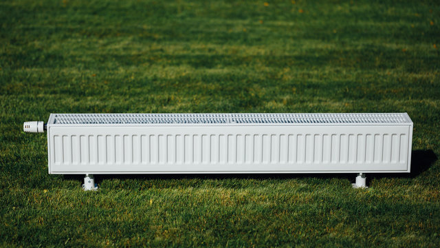 radiator on green lawn, ecological heating concept