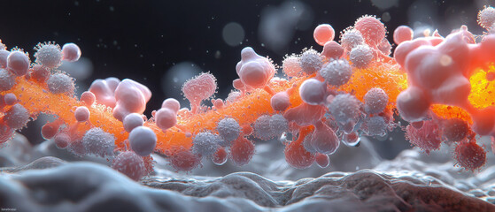 Norovirus outbreak concept and health themes, Microscopic view of colorful cells and particles, illustrating biological processes in a dynamic and vibrant environment.