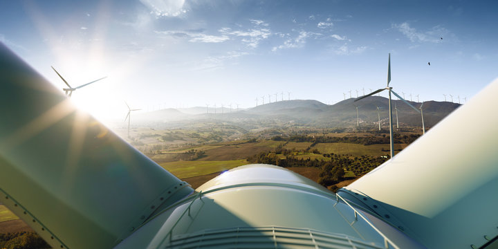 Windmill generator top wiev on the beautiful background. Sunset nature