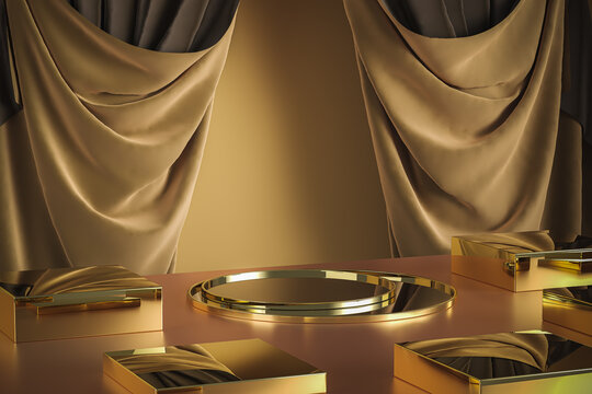 abstract mockup luxury scene, gold and shiny geometry on the champagne base was in front of beige curtains and backdrop
