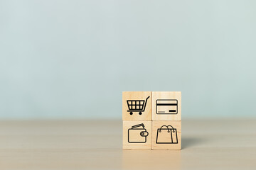 Online shop and e-commerce concept. Top view of using laptop. Many blue e-commerce icons.