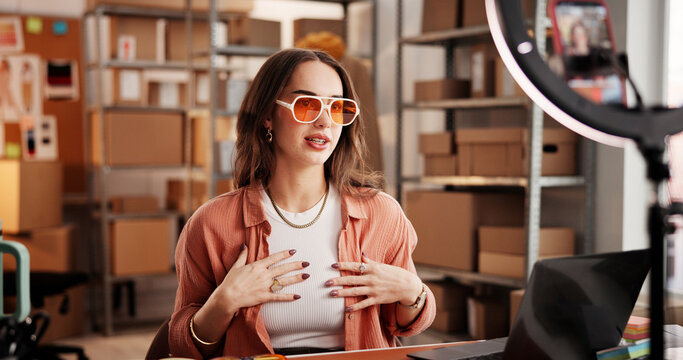 Sunglasses, live stream and ecommerce with woman in warehouse for startup promotion and chat. Content creation, online shopping ambassador and influencer with person and accessory for broadcast