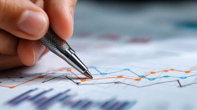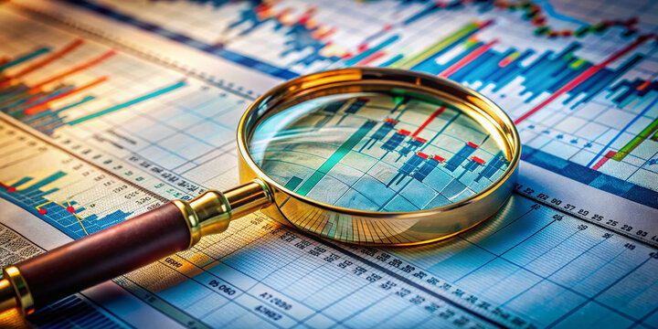A solitary magnifying glass zooms in on intricate financial charts and graphs scattered on a cluttered desk, scrutinizing market trends and economic indicators.