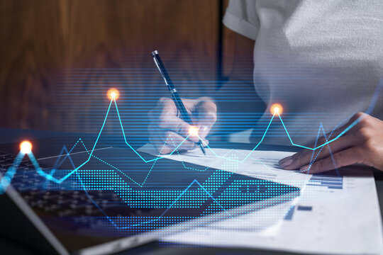 Woman signs agreement. Financial market chart and graph hologram. Double exposure . Business Analysis concept.