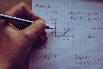 arm, hand and sleeve holding pen doing maths study notes with calculations and formulas