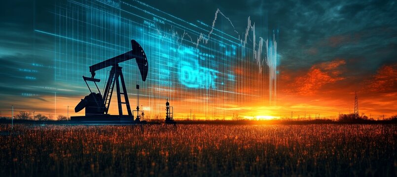 Oil Industry Pumpjack at Sunset with Financial Data and Economic Analysis Infographics Overlay