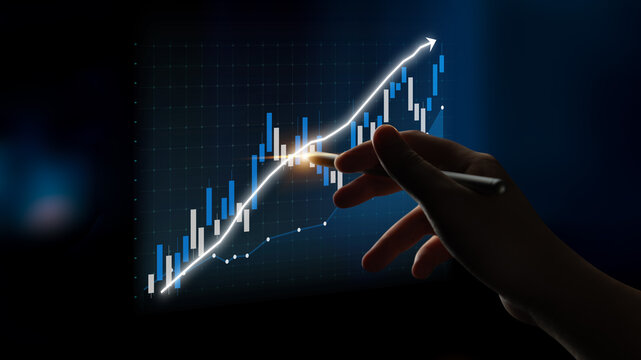 A hand points to a digital graph showcasing a stock market trend with an upward trajectory. This image represents financial growth and the power of data visualization in investments. Impute