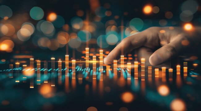 A digital visualization of stock market trends featuring detailed candlestick charts, data points, and a glowing interface. The sleek and modern design highlights the precision and