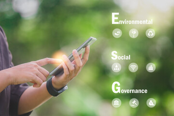 Hand holding Phone ESG icon concept in the hand for environmental, social, and governance in sustainable and ethical business on the Network connection on a green background.