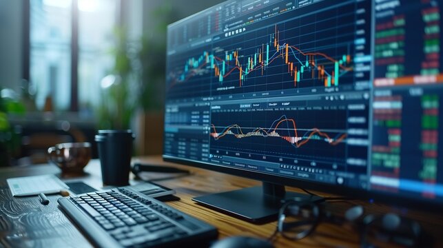 A comfortable workspace featuring a laptop with financial analytics on screen, accompanied by a hot beverage in a relaxed environment.