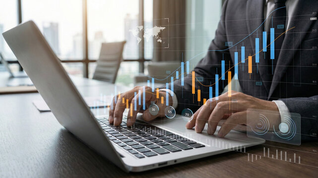 Businessman analyzing financial technology data for investment integration using laptop in modern office, visualizing digital charts, market trends, and fintech insights for economic strategy.