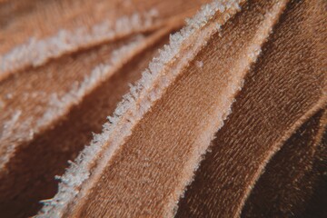 Frost covering delicate butterfly wings in a surprising and unexpected juxtaposition of tropical warmth and arctic cold