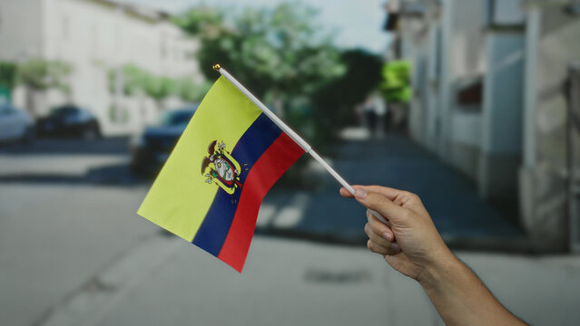 Hand of a man holds an ecuadorian flag outdoors on a sunny street, symbolizing national pride in an urban environment with blurred backgrounds of cars and buildings.
