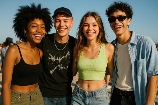 Gen z girl, selfie and friends on bridge, edgy clothes or smile for bonding in streetwear for fashion in summer. Women, group and happy with photography, post or trendy style for social media in city