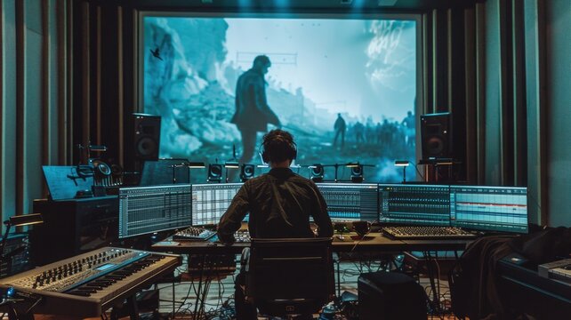A composer working in a studio, scoring music for a film with a large screen showing scenes in the background