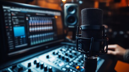 Microphone with audio mixer and sound editing equipment in a studio setting.