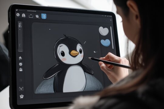 Digital artist creating adorable cartoon penguin on tablet with stylus