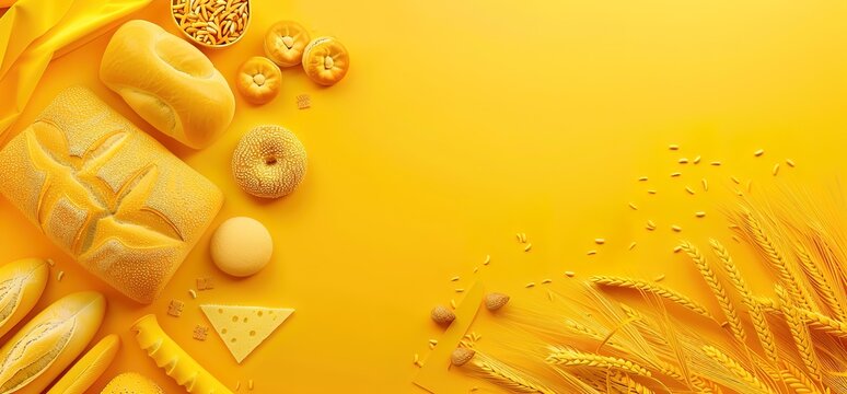 A flat lay composition of various food items on a bright yellow background. This image is ideal for food blogs, recipes, and advertising.