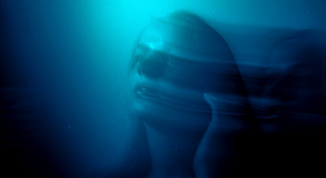 Dreamy moody cinematic portrait of a brunette woman with blue-aqua glow and long exposure