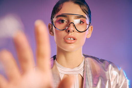 Trendy woman in vibrant holographic outfit and futuristic accessories showcases modern fashion