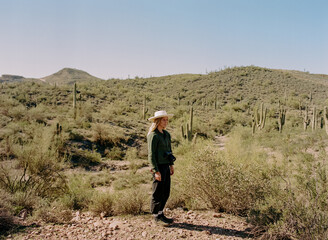 Avant-garde sculptural shoulders fashion portrait featuring red rock textured outerwear